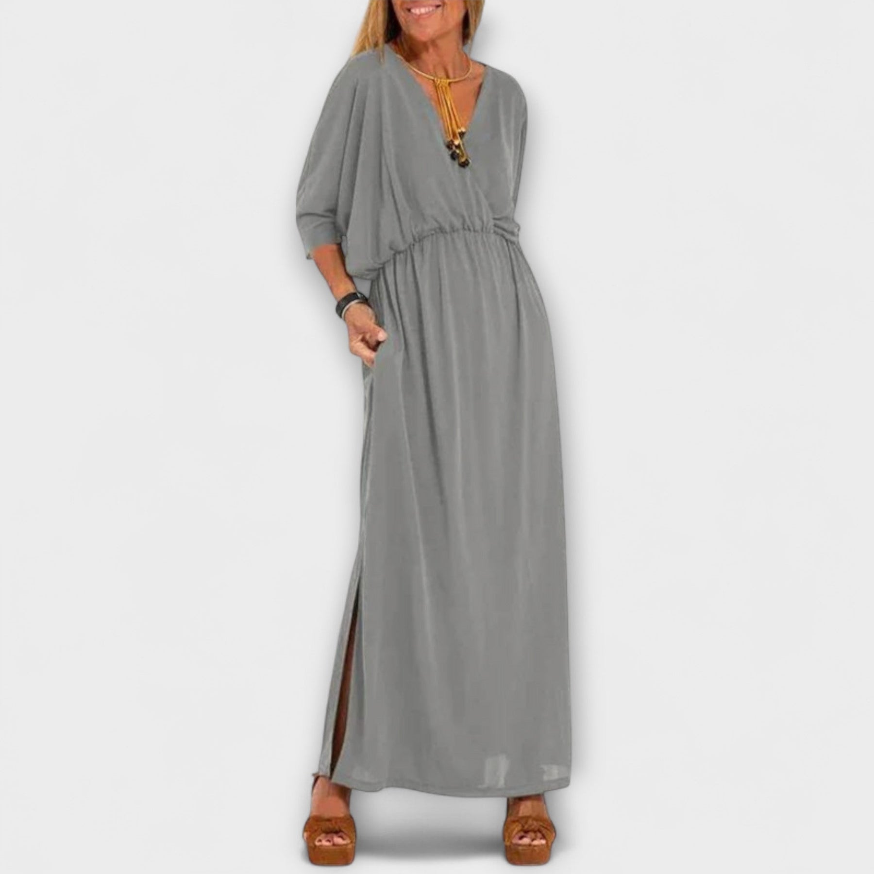 Este vestido está diseñado para equilibrar perfectamente las proporciones de tu cuerpo y es un imprescindible en cualquier armario. El corte experto se adapta a todas las formas y tamaños de cuerpo, permitiéndote sentirte segura y hermosa.