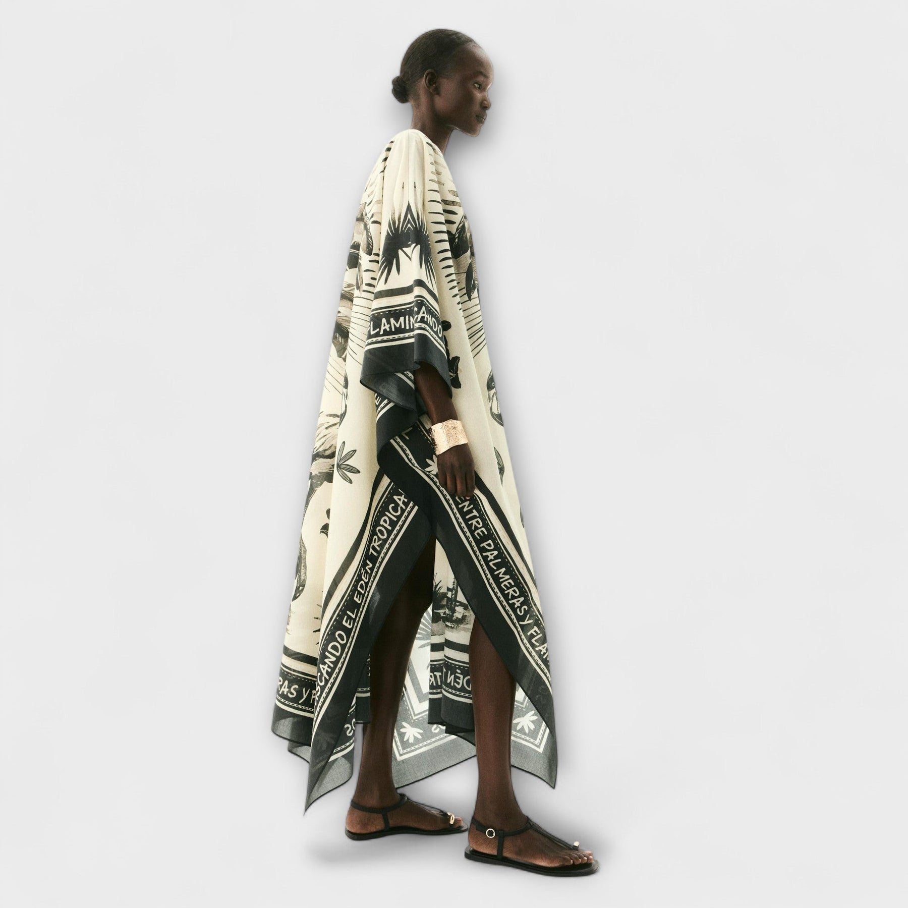 Agrega un toque de elegancia a tu estilo vacacional con nuestro vestido kaftán de flamencos de gran tamaño, diseñado para una elegancia y comodidad sin esfuerzo. Esta impresionante pieza presenta un estampado juguetón de flamencos y palmeras sobre una base chic de color beige claro y negro.